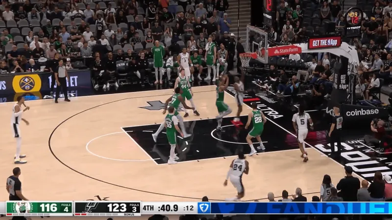 ——剩下41秒前,还是与文班亚马挡拆,强突凯尔特人三人防线,上篮打进,还造成犯规(加罚没进),这一球可以说杀死了比赛