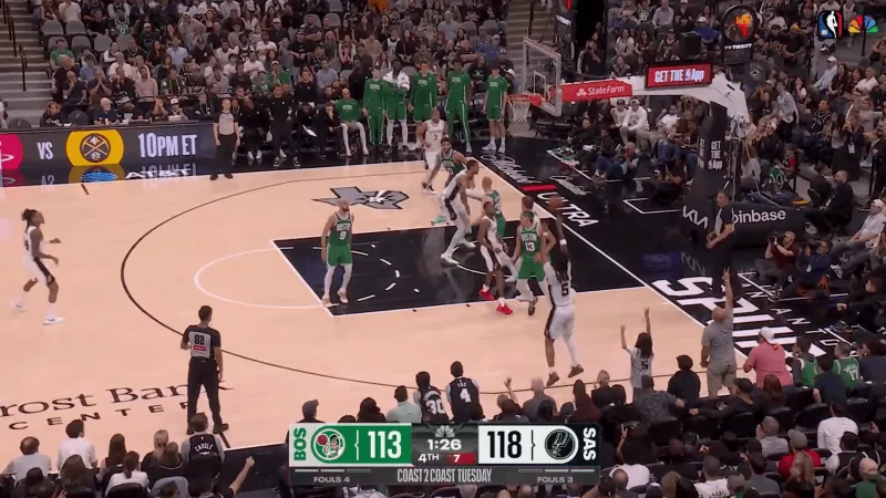 ——剩下41秒前,还是与文班亚马挡拆,强突凯尔特人三人防线,上篮打进,还造成犯规(加罚没进),这一球可以说杀死了比赛