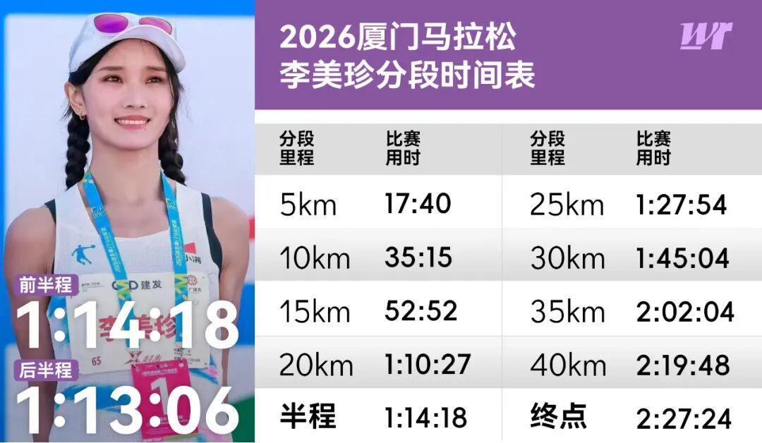 2025年的厦马,李美珍在和唐教练沟通后,决定在比赛中尝试下负分割战术,最终以2:30:12完赛。也正是通过那场比赛,她找到了自己的特点。“我发现前面跑慢点,后面也确实能把速度加起来。那之后,唐导也知道我是属于这种(可以跑负分割的)类型的。”